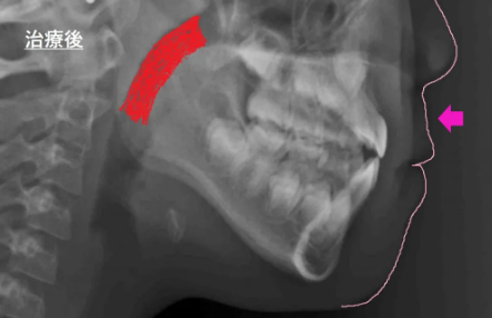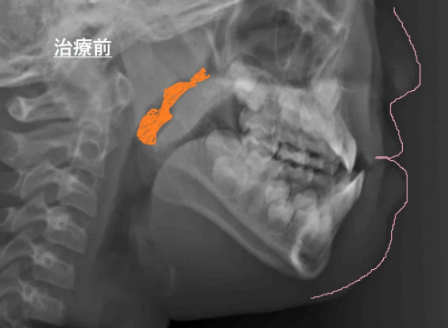 • 気道が広くなっています!!!!(治療前はオレンジの部分、治療後は赤い部分。赤い部分が広くなっているのがわかりますか?ここが気道で、広いほうが呼吸がしやすいです!!!!)